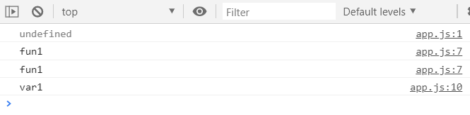 What would you expect the console output of the following code to be? When I first looked at this code, I thought that either the JavaScript engine would throw an error or the variable and function instantiation would not matter and it would print this sequence, “var1” “fun1” “fun1” “var1”. Instead, this was the console output!