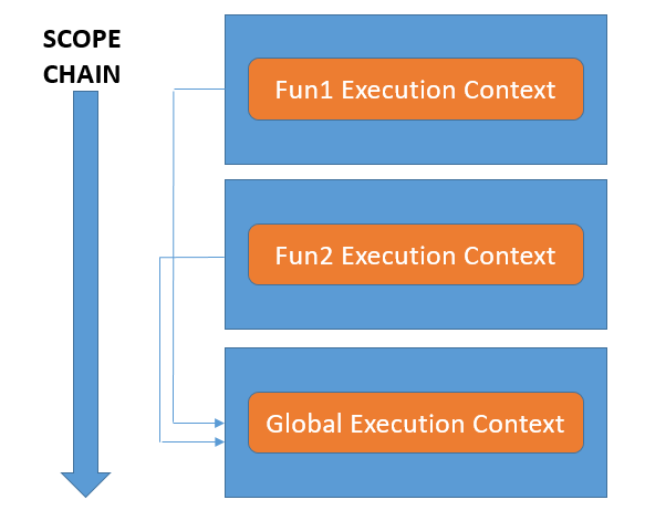 Here when the program is starting, a Global Execution Context is created. fun1 and fun2 are assigned places in memory, the global object is created and this is assigned to it during the Creation Phase.
